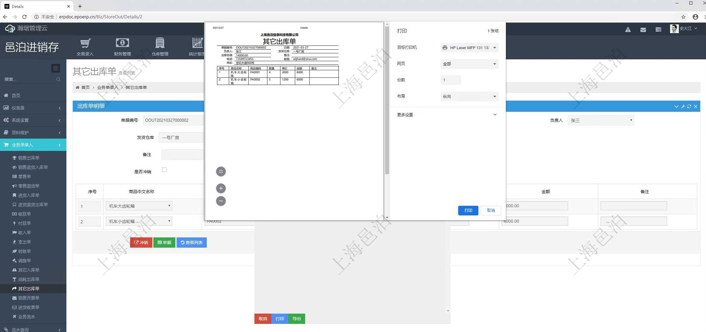 對打印進行設置后即可將目前的表單信息通過紙質的形式加蓋下。在進展打印設置的時候,可以將不需要打印的字段進行雙擊,會自動跳轉到左側不打印字段里面去。