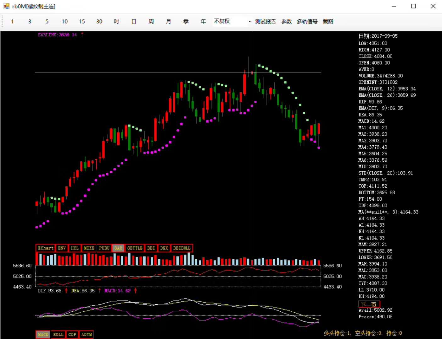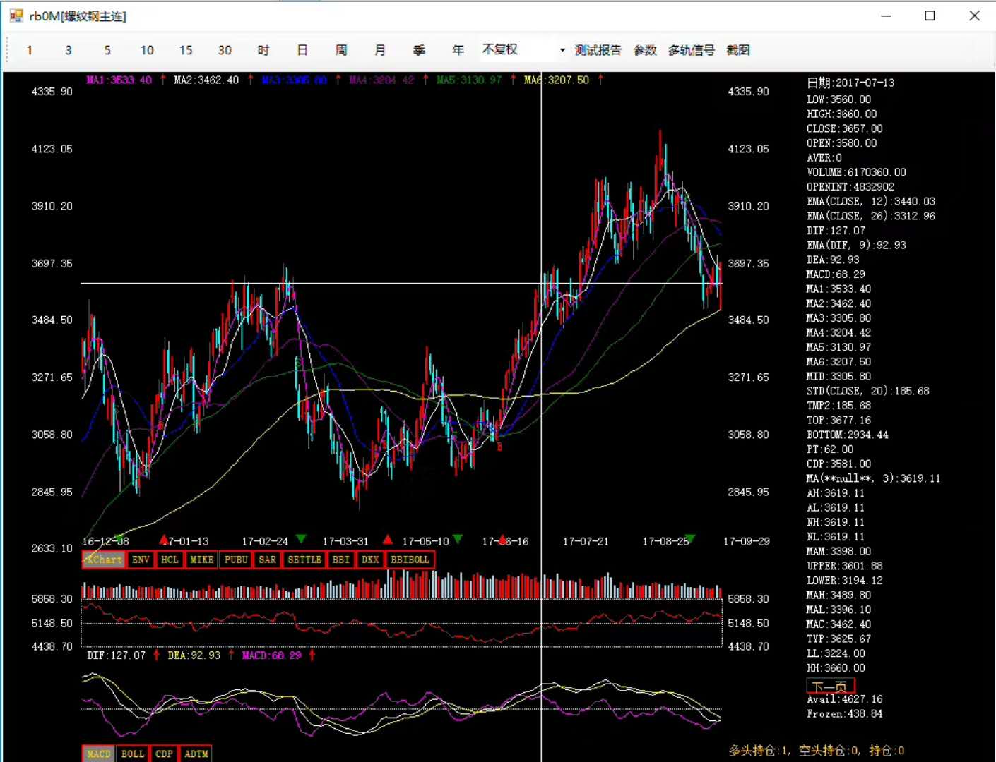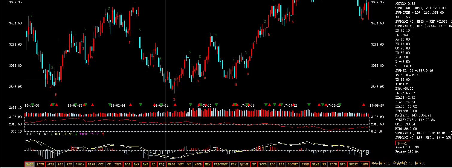 ADTM動態買賣氣指數, ARBR人氣意愿指標, ASI振動升降指標, ATR真實波幅, B3612三減六日乖離, BIAS乖離率, CCI順勢指標, CR能量指標, DBCD異同離差乖離率, DDI方向標準離差指數, DMA平均線差, DMI趨向指標, KD隨機指標, KDJ隨機指標, MACD平滑移動平均線, MASS, MFI資金流量指標, MI動量指標, MICD異動離差動力指數, MTM動力指標, Price Oscillator, PSY心理線, QHLSR阻力指標, RC變化率指數, RCCD異同離差變化率指數, ROC變動速率, RSI相對強弱指標, SLOWKD慢速KD, SRDM動向速率比率, SRMI MI修正指標, WR威廉指標, ZDZB 筑底指標, DPO 區間震蕩線, SHORT短線指標, LONG長線指標。