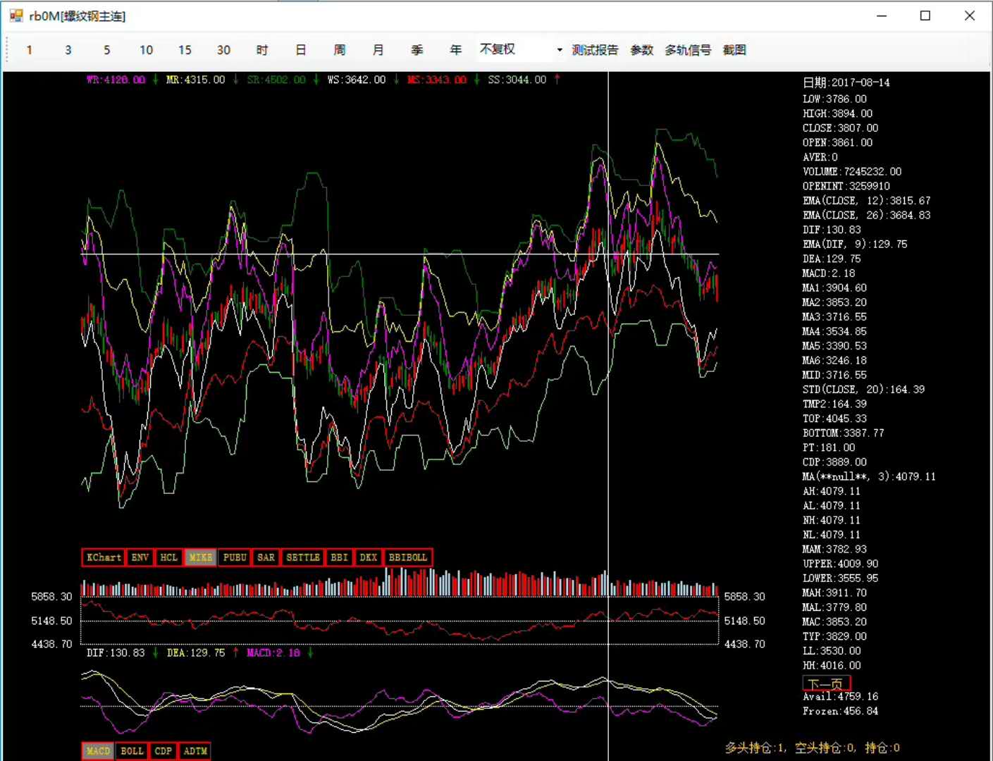 MA移動平均線組合,BOLL布林通道線,CDP逆勢操作,Envalops,HCL均線通道,MIKE麥克指標,PUBU瀑布線, SAR 止損線, SP日內均價線, BBI多空指數, DKX多空線, BBIBOLL多空布林線。